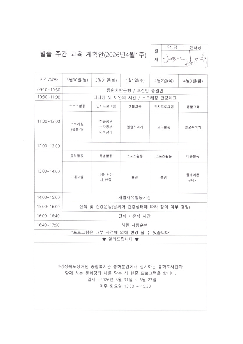 별솔주간보호센터 2026년 4월 1주차 주간계획 페이지 정보 작성자 최고관리자 댓글 0건 조회 6회 작성일 26-03-30 17:51 본문 4월 1주차 주간계획 목록 다음글별솔주간보호센터 2026년 3월 4주차 주간계획 26.03.23 댓글목록 댓글목록 등록된 댓글이 없습니다.
