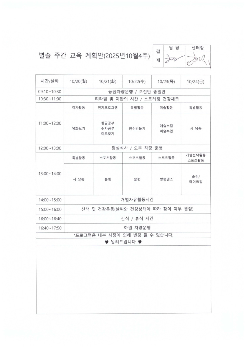 별솔주간보호센터 2025년 10월 4주차 주간계획 페이지 정보 작성자 최고관리자 댓글 0건 조회 163회 작성일 25-10-16 09:55 본문 10월 4주차 주간계획표 목록 이전글별솔주간보호센터 2025년 10월 5주차 주간계획 25.10.24 다음글별솔주간보호센터 2025년 10월 3주차 주간계획 25.10.16 댓글목록 댓글목록 등록된 댓글이 없습니다.