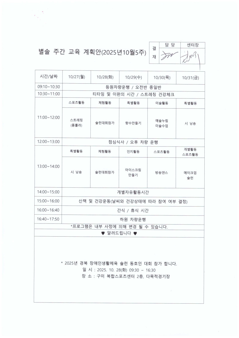 별솔주간보호센터 2025년 10월 5주차 주간계획 페이지 정보 작성자 최고관리자 댓글 0건 조회 119회 작성일 25-10-24 18:01 본문 10월 5주차 주간계획표 목록 이전글별솔주간보호센터 2025년 11월 1주차 주간계획 25.11.04 다음글별솔주간보호센터 2025년 10월 4주차 주간계획 25.10.16 댓글목록 댓글목록 등록된 댓글이 없습니다.