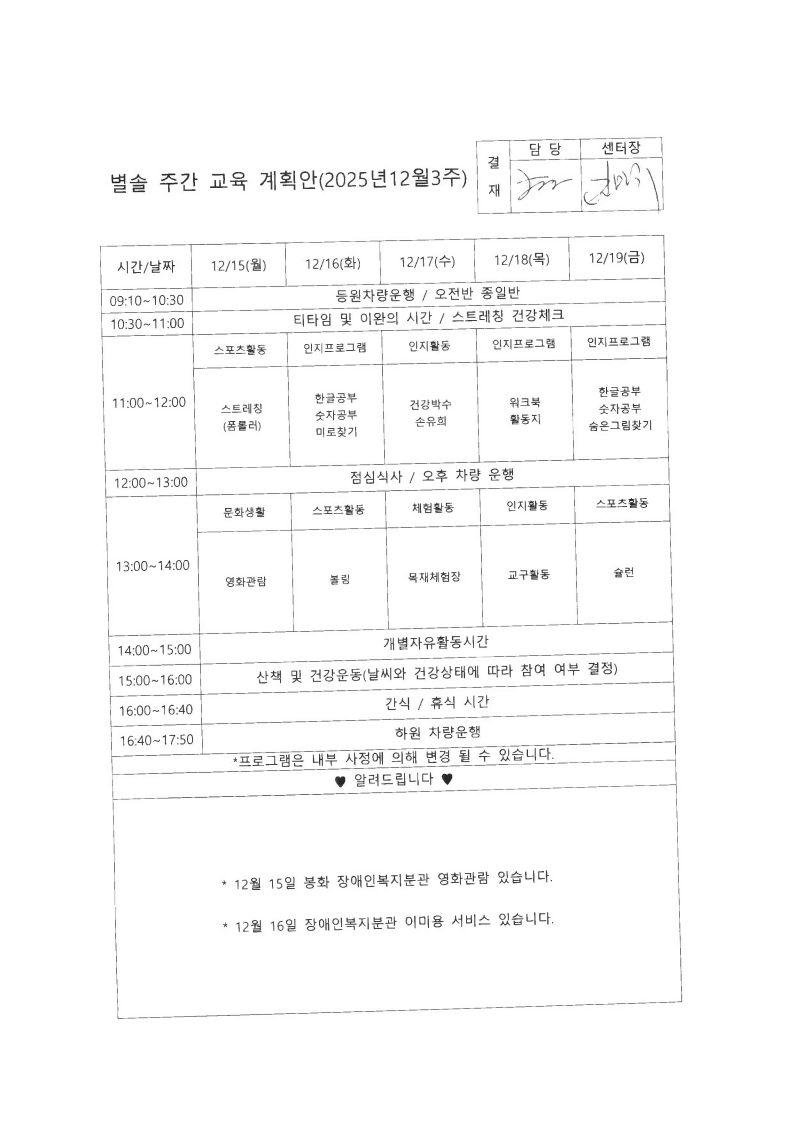 별솔주간보호센터 2025년 12월 3주차 주간계획 페이지 정보 작성자 최고관리자 댓글 0건 조회 85회 작성일 25-12-15 11:11 본문 12월 3주차 주간계획표 목록 이전글별솔주간보호센터 2025년 12월 4주차 주간계획 25.12.22 다음글별솔주간보호센터 2025년 12월 2주차 주간계획 25.12.05 댓글목록 댓글목록 등록된 댓글이 없습니다.
