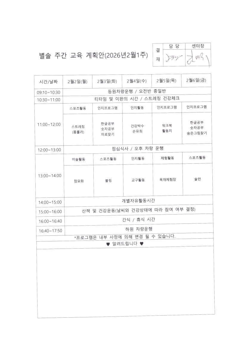 별솔주간보호센터 2026년 2월 1주차 주간계획 페이지 정보 작성자 최고관리자 댓글 0건 조회 69회 작성일 26-01-30 09:46 본문 2월 1주차 주간계획 목록 이전글별솔주간보호센터 2026년 2월 2주차 주간계획 26.02.04 다음글별솔주간보호센터 2026년 1월 4주차 주간계획 26.01.28 댓글목록 댓글목록 등록된 댓글이 없습니다.